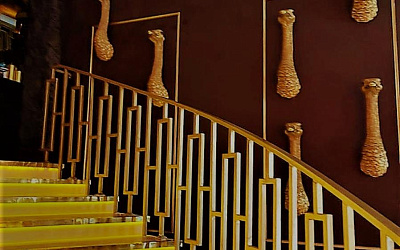 1 этаж. С первых шагов вы будите поражены уникальностью Tommy Lee. Скалообразный мраморный стол с «Welcome» зоной, уникальная лестница с латунными элементами, декоративные головы Африканских страусов все это поражает и удивляет с первого взгляда.